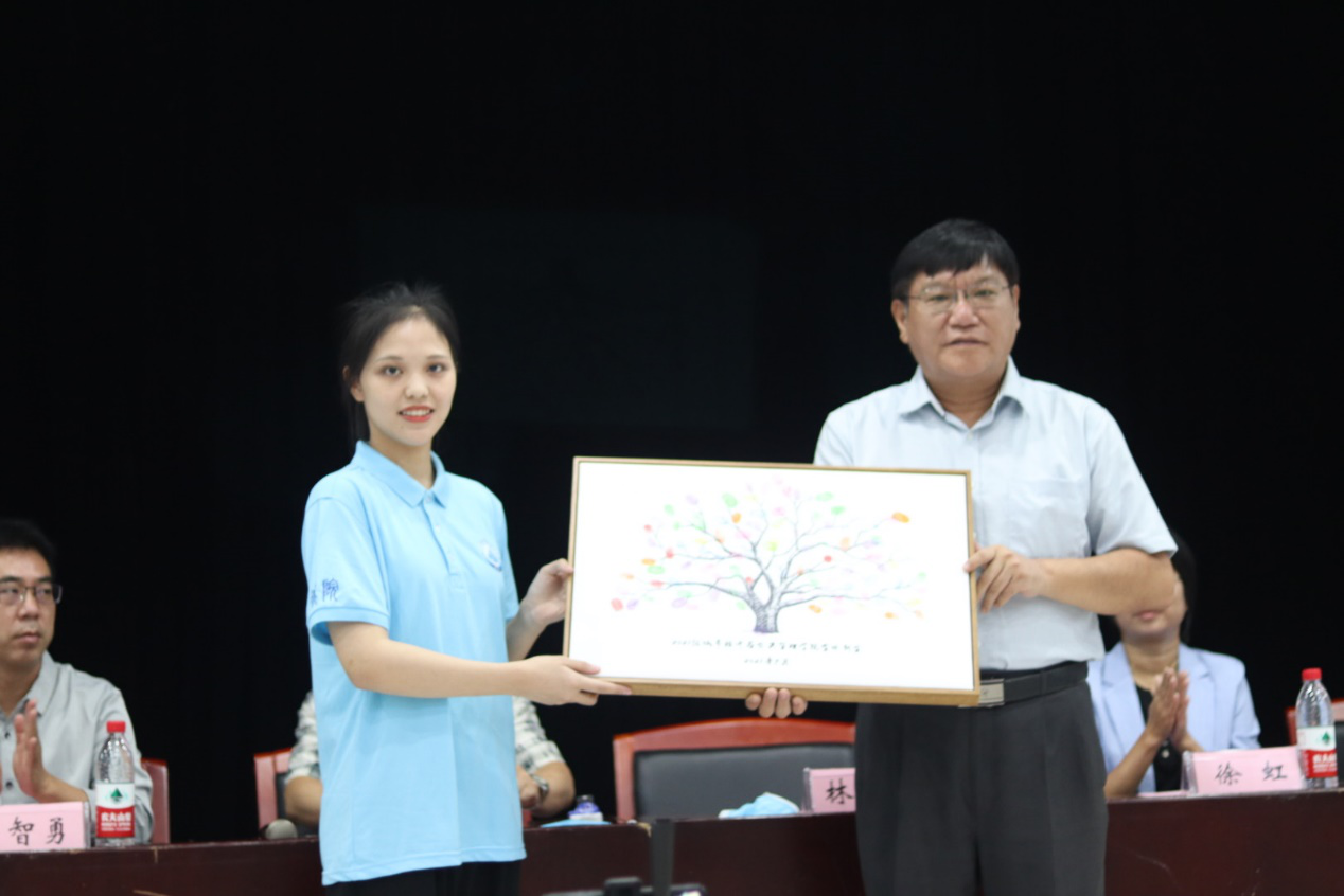 言毕,她代表全体在校生向新生代表周润湫赠送了由全院师生精心挑选的、有助于新生成长的书籍,象征着城院学子学识的薪火相传,寄托着全体在校生对于新同学的美好希望。