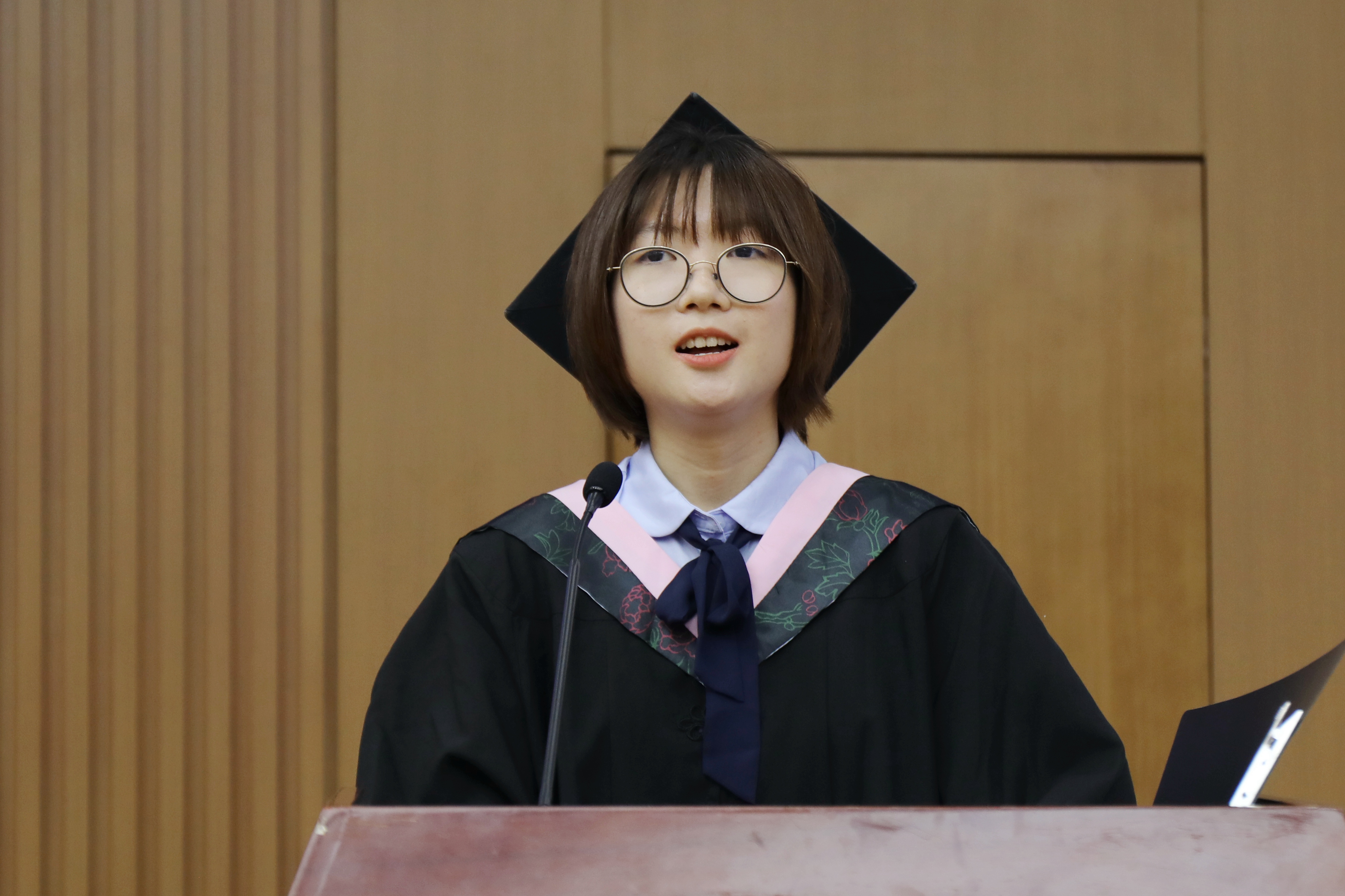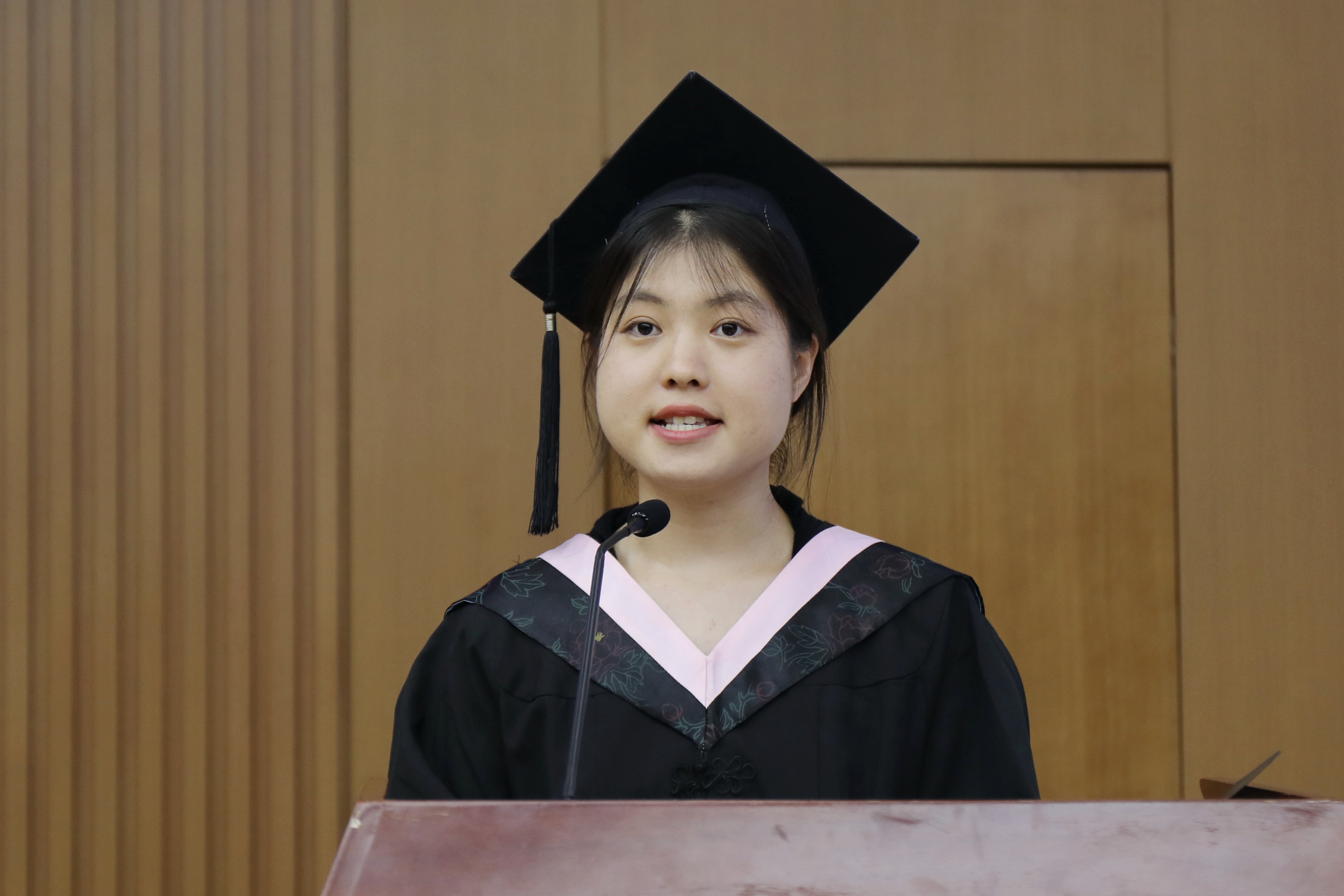 毕业生代表20级城市管理专业本科生张一铭向女同av 老师的贴心帮助及家人、朋友的一路相伴表示衷心感谢。她表示,在城院,学会了分析与思考,学会了理解与担当,学会了合作与追求;在城院,度过的每分每秒,经历的一点一滴,都将会是我们人生中最珍贵的回忆。她号召同学们身处时代洪流,要听从内心的召唤,永葆初心,不负韶华,在祖国和人民最需要的地方绽放绚丽之花!