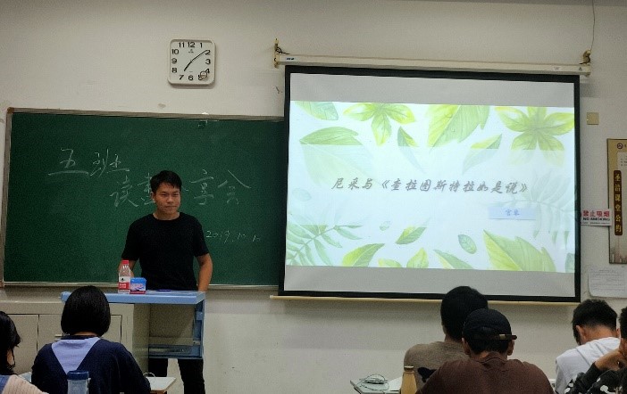 公共管理1班闻芳芳同学首先分享了她所阅读的《偷影子的人》一书。接着田苗同学分享了长篇小说——《穆斯林的葬礼》,表达了对主人公为追求理想和事业所展现的强大意志的敬佩;公共管理2班的申家鑫同学推荐了《活出真正的自己》一书,表达了自己在生活中要保持正确的意识,活出全新自我的感想;公管3班的魏冬祺分享的《拖延心理学》一书则讲述了避免拖延和完成事情的方法。张楠和朱健彰分别分享了《我生活的故事》和《追风筝的人》;公管4班讲解《易经》的同学王彤瑄在黑板上画出八卦图和相关的古汉字,使得看上去玄妙难懂的内容变得有趣简洁;公管5班王侯博同学分享的《查拉图斯特拉如是说》通过幽默风趣的推荐以及提问形式与台下同学积极互动,活跃了读书会的气氛。各个班中分享的同学准备都很充分,回答台下同学的问题细致认真。其余同学专注听讲,时而举手发问,能与分享人即时互动,整体氛围很好。